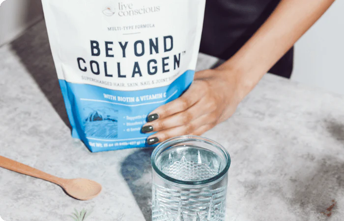 Live Conscious Collagen Peptides delivers types I & III collagen for radiant skin, thicker hair, durable nails, and easier movement.